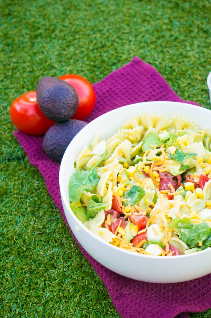 SaladeWas de tomaten en snij ze in kwartjes. | Droog de mozzarella en snij in blokjes. | Was de spinazie en snij deze in grove stukken. | Verwijder de schil en pit van de avocado's en snij het vruchtvlees in blokjes. | Giet de mais af. | Voeg alles toe aan de pasta en meng alles goed door elkaar. | Maak de pasta af met wat van de geraspte cheddar. |