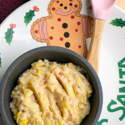 Bij kerst denk ik altijd direct aan lekker gezellig eten. Samen met je gezin, familie en vrienden aan tafel en de heerlijkste dingen eten. Bij ons thuis eten wij traditie getrouw kalkoen. Ja op ze Amerikaans en ik vind het heerlijk. Maar zie jij jouw baby al een kalkoenpoot weg knagen zonder tanden? Nope! Parker is nu al 1 jaar en heeft al wat tanden dus die kan wel wat grovere stukjes eten. Mocht jouw kleine dit echter nog niet kunnen dan heb het diner voor jouw baby’s eerste kerst! Ik heb het over Baby’s Kerstkalkoen Diner. Yup met kalkoen, mais, aardappels en cranberry’s. Alles wat bij ons op tafel staat met de kerst. Gezellig samen zijn en daar hoort ook jouw baby bij.