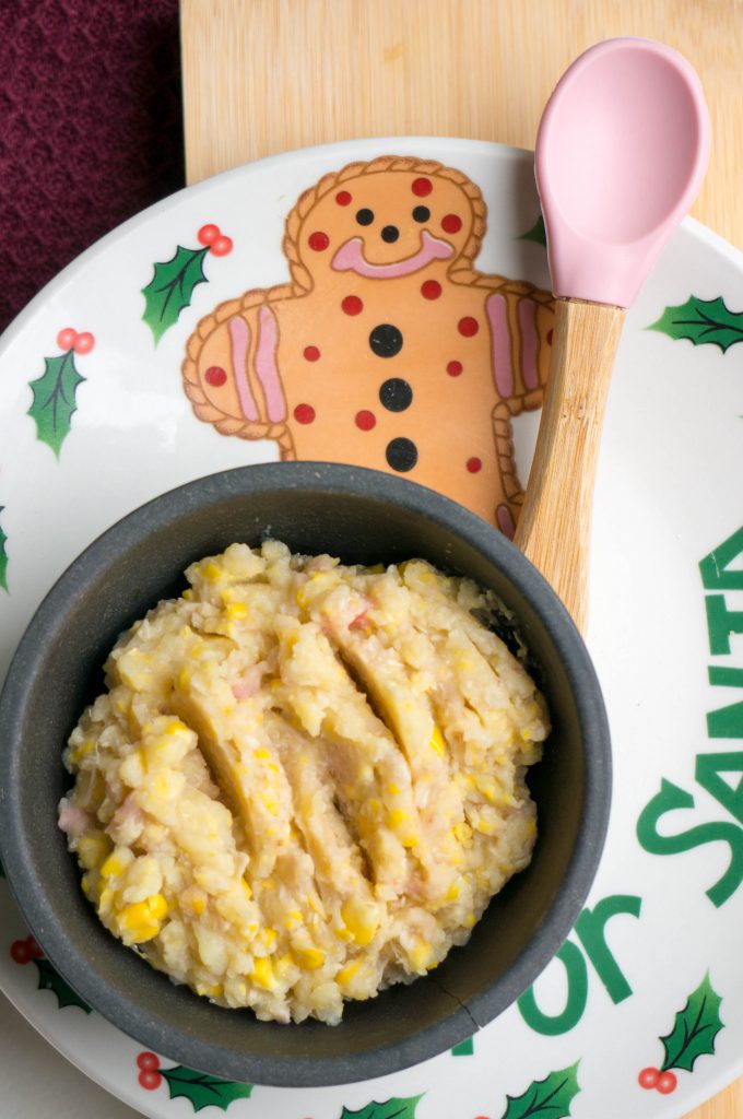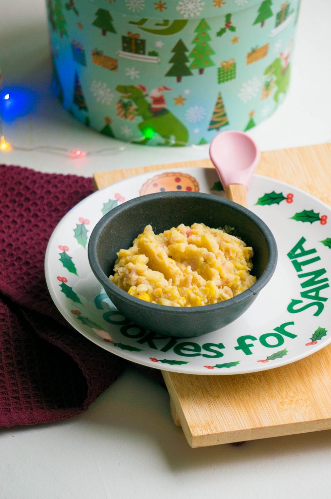 Bij kerst denk ik altijd direct aan lekker gezellig eten. Samen met je gezin, familie en vrienden aan tafel en de heerlijkste dingen eten. Bij ons thuis eten wij traditie getrouw kalkoen. Ja op ze Amerikaans en ik vind het heerlijk. Maar zie jij jouw baby al een kalkoenpoot weg knagen zonder tanden? Nope! Parker is nu al 1 jaar en heeft al wat tanden dus die kan wel wat grovere stukjes eten. Mocht jouw kleine dit echter nog niet kunnen dan heb het diner voor jouw baby’s eerste kerst! Ik heb het over Baby’s Kerstkalkoen Diner. Yup met kalkoen, mais, aardappels en cranberry’s. Alles wat bij ons op tafel staat met de kerst. Gezellig samen zijn en daar hoort ook jouw baby bij.
