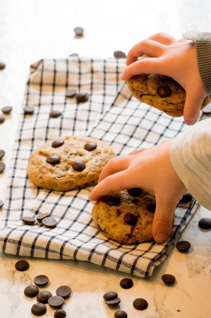 Mijn favoriete en door vele geliefde koekjes zijn mijn Chocolate Chip Cookies. Dun en chewy zijn mijn absoluut favoriet en ik heb bijna altijd wel een roldeeg in de vriezer liggen. Voor de ROLO Spin koekjes, die ik met Halloween maakte. Wou ik echter liever dikke chocolate chip koekjes. Ik heb verschillende recepten getest, waar heel veel van niet werkte zoals ik ze wou: te dun of gewoon niet lekker. Tot ik tot dit recept kwam. Een chocolate chip cookie die wat dikker is, iets meer cake-ig, maar wel lekker en perfect om verder mee aan de slag te gaan.