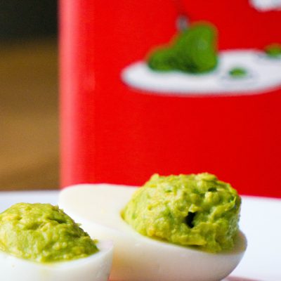 Maak met twee theelepels een mooi bolletje van het avocado-mengsel. Schep het in de ei-er helften.