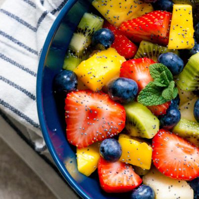 Op zoek naar een fris nagerecht voor na de barbecue? Maak eens deze heerlijk makkelijke Fruitsalade met Maanzaad-Citroen Dressing.