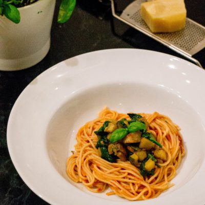 Het uitproberen van nieuwe pasta recepten leiden tot het maken van gestoofde groente spaghetti met zelfgemaakte tomatensaus.