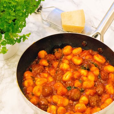 Sinds wij voor 80-90 % van de tijd vegetarische eten, eten we eigenlijk nooit echt vlees of vleesvervangers bij pasta. Toch vind ik het leuk om soms eens nieuwe dingen proberen. Pasta met gehaktballetjes is een klassiek gerecht, dus waarom niet gnocchi met vegetarische balletjes.