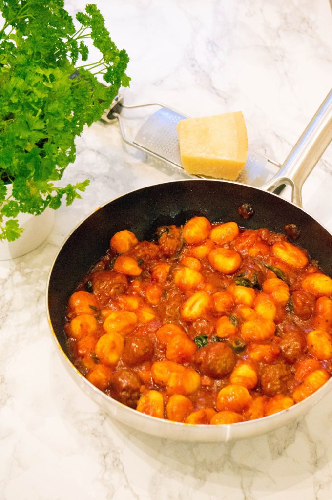 Sinds wij voor 80-90 % van de tijd vegetarische eten, eten we eigenlijk nooit echt vlees of vleesvervangers bij pasta. Toch vind ik het leuk om soms eens nieuwe dingen proberen. Pasta met gehaktballetjes is een klassiek gerecht, dus waarom niet gnocchi met vegetarische balletjes.
