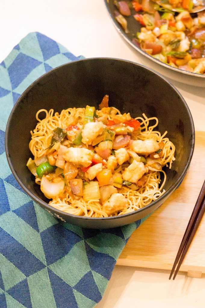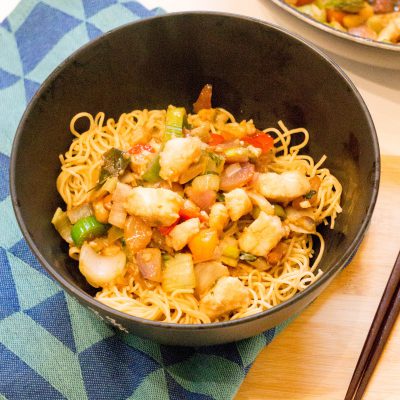 Ik probeer steeds meer recepten te maken met vis. Mijn gezin eet namelijk veelte weinig is. Ik ben er dol op, maar mijn man niet. Ja witvis dat lust hij wel, maar zalm, garnalen of sushi gaat er niet in. Hoe zit het met de kids? Die lusten veel meer soorten vis dan hun vader. Gaan we naar de visboer dan gaan hun niet voor de kibbeling of vispatat. Nee die bestellen een haring en ook worden ze blij van een stukje paling. Heerlijk! Meer vis dus op het menu is mijn voornemen en dat in makkelijke maaltijden. Vandaag als makkelijke maaltijd: Kabeljauw in Sojasaus met Noodles.