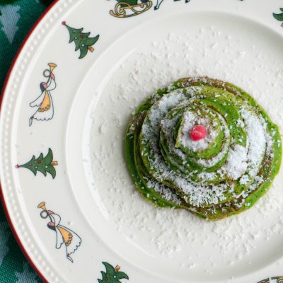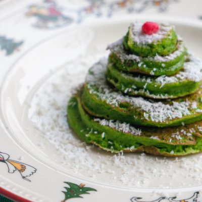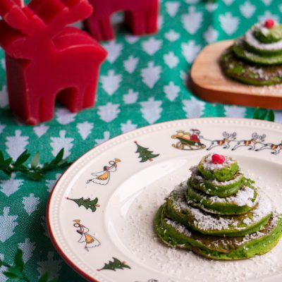De kerstbomen pannenkoeken heb ik met ronde steekvormen gemaakt. Heb je deze niet geen probleem. Het idee is gewoon verschillende grote pannenkoeken te maken en deze vervolgens op te stapelen. Maak af met wat poedersuiker en roodfruit als frambozen, aalbessen of granaatappel pitten.
