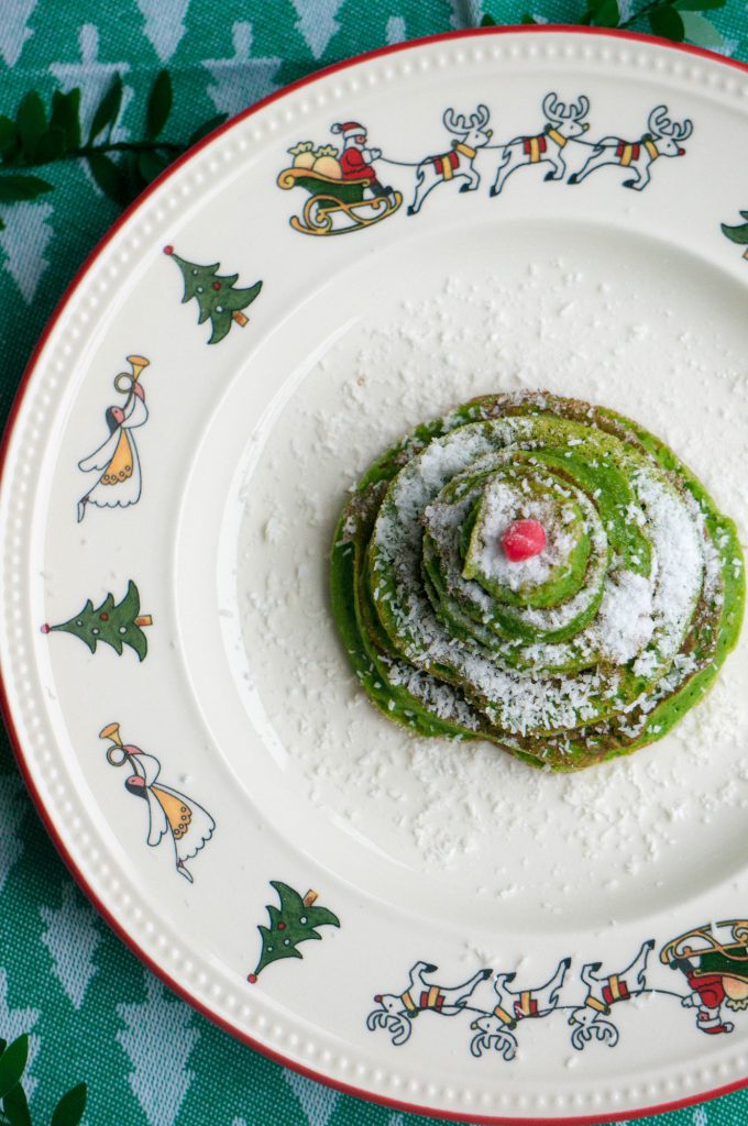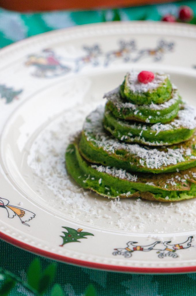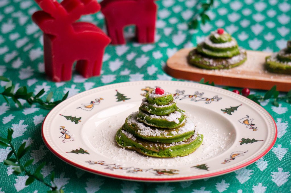 De kerstbomen pannenkoeken heb ik met ronde steekvormen gemaakt. Heb je deze niet geen probleem. Het idee is gewoon verschillende grote pannenkoeken te maken en deze vervolgens op te stapelen. Maak af met wat poedersuiker en roodfruit als frambozen, aalbessen of granaatappel pitten.