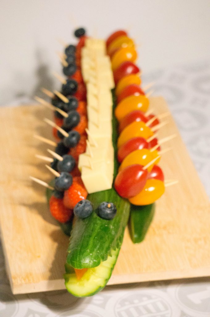 Bedankt voor je uitleg! Mijn zoon wilde graag iets met een krokodil trakteren en ik vond wel heel veel ideeën, maar dit is de enige met een degelijke uitleg die ik tegenkwam. Ik heb (uiteraard) wel wat gevarieerd (zonder kaas, watermeloen als tong), maar het is gewoon erg leuk om te maken. Ik was bang dat het snijgen van de krokodil moeilijk zou zijn — ik had zelfs twee reservekomkommers gekocht mocht ik er één verprutsen — maar dat ging eigenlijk best lekker.