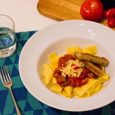 Aubergine Saus.Schenk 2 etlp olijfolie in een pan en bak de aubergine in 10 minuten goudbruin en zacht. | Was en halveer in tussen de cherry tomaten. | Voeg de cherrytomaten en pastasaus toe en roer alles door elkaar. Laat dit nog 4 minuten staat. | Schep de pasta op de borden met de saus erop. | Serveer de worstjes en wat geraspte kaas erbij. |