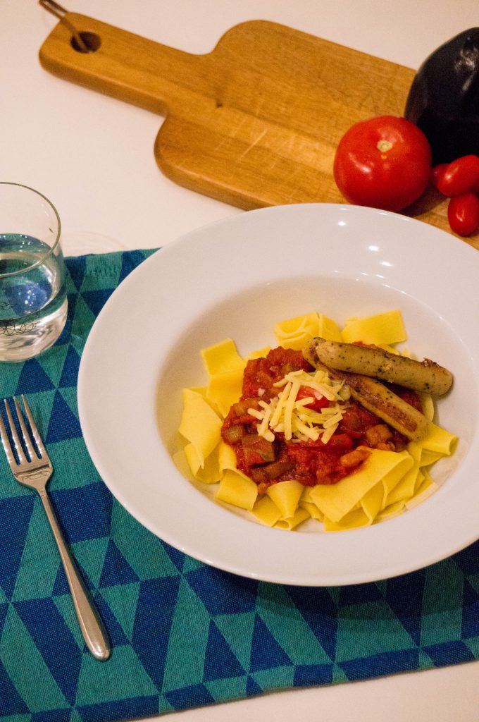 Aubergine Saus.Schenk 2 etlp olijfolie in een pan en bak de aubergine in 10 minuten goudbruin en zacht. | Was en halveer in tussen de cherry tomaten. | Voeg de cherrytomaten en pastasaus toe en roer alles door elkaar. Laat dit nog 4 minuten staat. | Schep de pasta op de borden met de saus erop. | Serveer de worstjes en wat geraspte kaas erbij. |