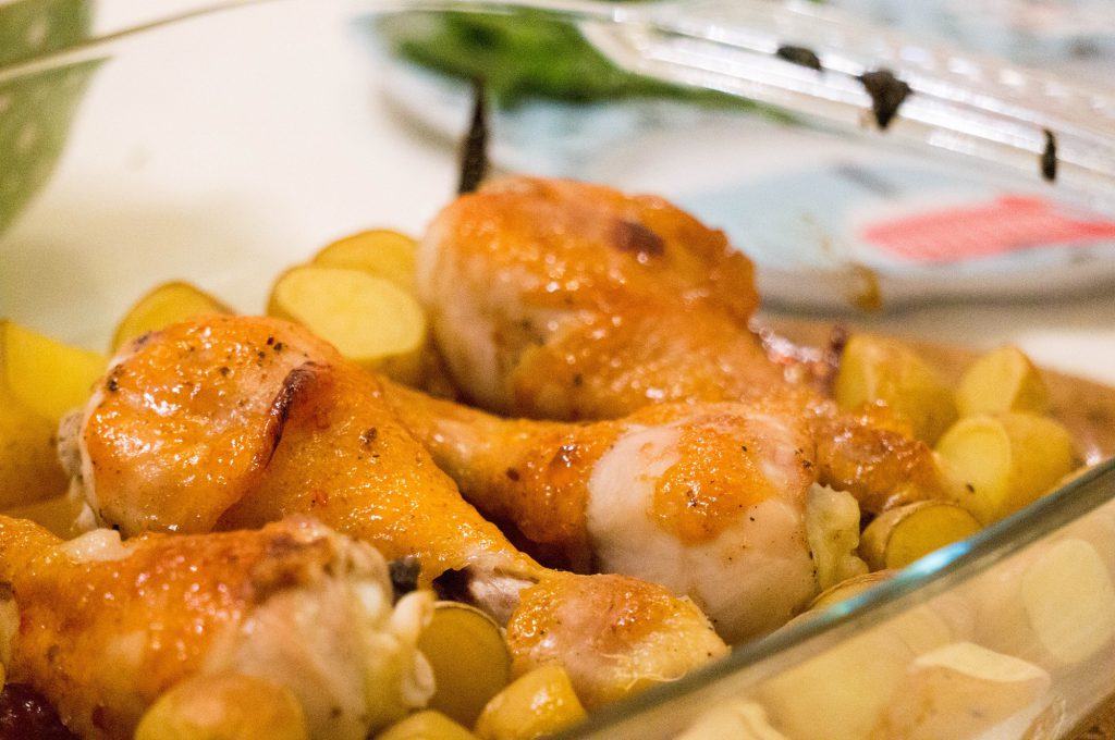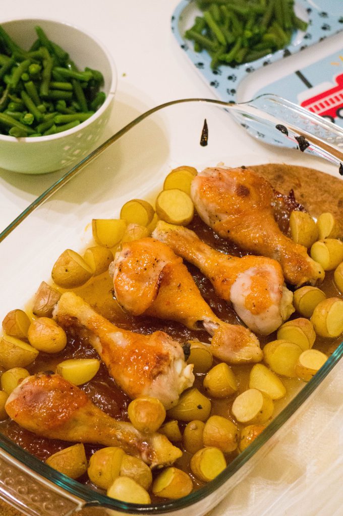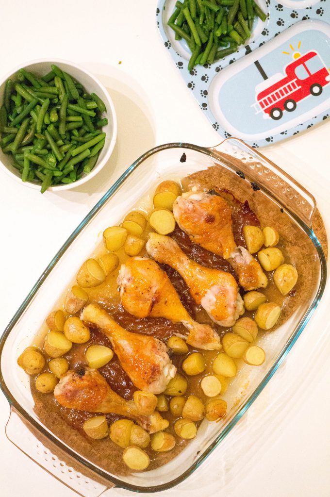 Ken je dat: een goed gevulde voorraadkast vol met potjes, zakjes, pakjes, blikjes en noem het maar op. Dat je af en toe eens de datums moet controleren of uberhaupt wat je hebt. Een keer in de zoveel maanden neem ik daarom eens mijn keukenkastjes eens goed onder handen en zo trof ik laatst maar liefst twee potten mango chutney. Hoe ik er aan kom? Geen idee, je zou zeggen je koopt het zelf. Ik kan mij echter de laatste keer dat wij mango chutney aten niet meer herrinderen. Tijd dus om eens wat te doen. Ik maakte mango sticky kippenpoten met aardappeltjes en sperziebonen. Een gerecht wat nog geen 10 minuten werk is en wel nog 30 minuten in de oven moet. Super voor een doordeweekse maaltijd.