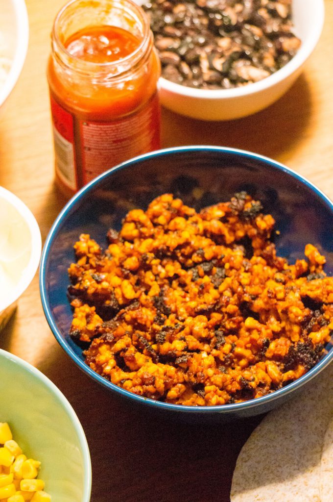 We zouden tortilla’s eten en daarom besloot ik een Mexicaans gehaktmengsel te maken met de tempeh. Wat ontzettend makkelijk en snel te maken is. Het belangrijkste: goed fijn hakken en de juiste smaakvolle (niet te zoute) Mexicaanse/Texmex kruidenmix. Je hoeft de tempeh alleen even op te bakken en nog wat tomatenpuree erbij en je bent klaar.