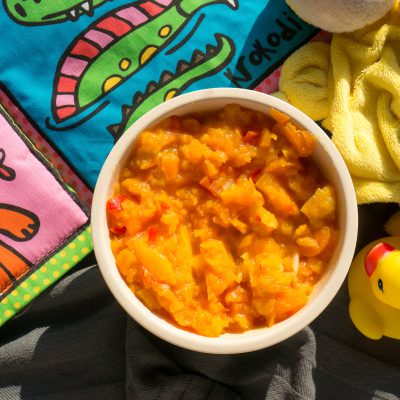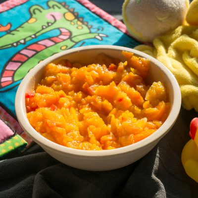 De najaarsgroente bestaat uit: pompoen, wortel, paprika en prei. In de kant-en-klare zak zat ook nog rode ui, dit zou ik persoonlijk zelf pas van af één/ander halfjaar toevoegen. De groenten kun je lekker roerbakken met wat aardappels en serveer je zo of met nog wat vlees of vis.
