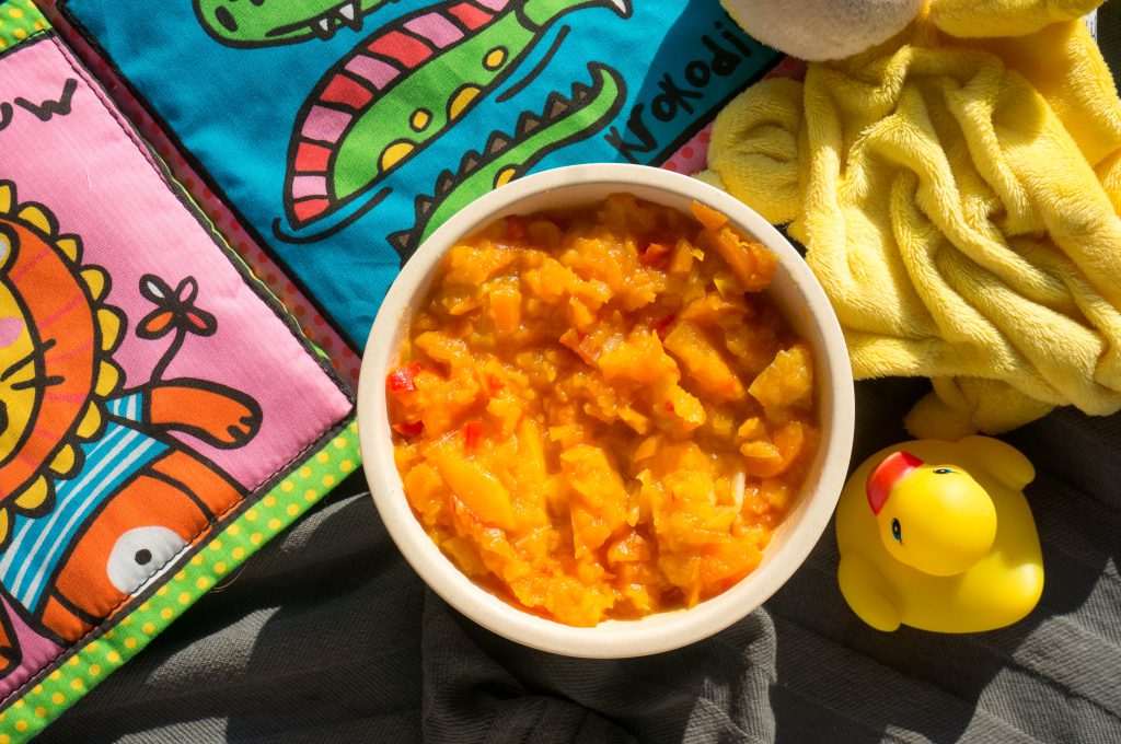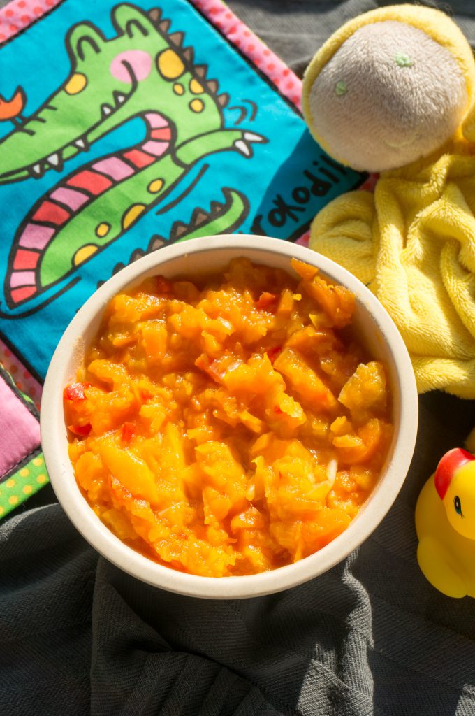 De najaarsgroente bestaat uit: pompoen, wortel, paprika en prei. In de kant-en-klare zak zat ook nog rode ui, dit zou ik persoonlijk zelf pas van af één/ander halfjaar toevoegen. De groenten kun je lekker roerbakken met wat aardappels en serveer je zo of met nog wat vlees of vis.