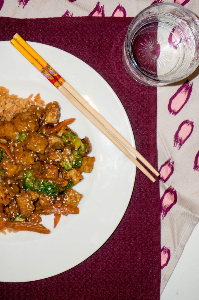 Ik vind het leuk om een beetje te experimenteren met wok sauzen. Vaak genoeg als ik snel wat op tafel wil dan gebruik ik gewoon kant-en-klare wok sauzen, maar ik vind het ook leuk om zelf eens wat te proberen. Dit maal gebruikte ik daar pindasaus voor. Ik keek naar de ingrediënten van mijn kip saté traybake en dacht hoe kan ik dat naar een roerbak saus vertalen. Het resultaat is een aanrader en gezien de kids ook op saté saus dol zijn, vonden ze dit ook lekker. Behalve dan, dat Logan nu weer geen tempeh lekker vind. Gelukkig zat er wel broccoli bij, want daar is hij dol op!