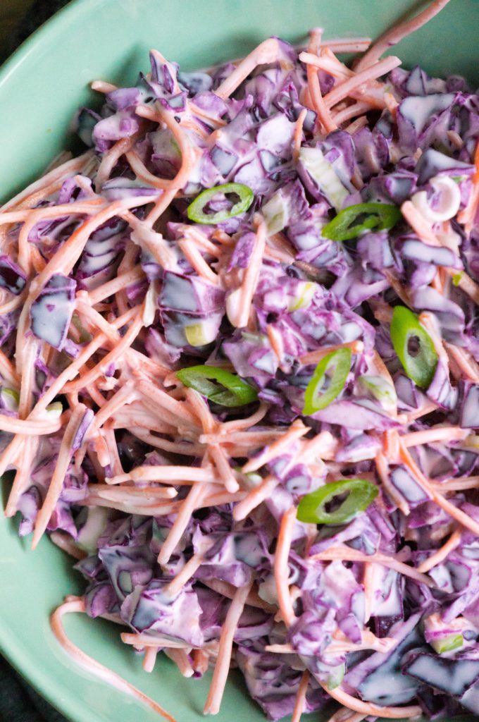 De volgende dag aten we op verzoek van logan chicken wings, en ja wij eten eigenlijk geen vlees meer, maar op verzoek van de kinderen maak ik wel eens een uitzondering. Omdat ik vooral al wist dat de kippenpoten zwaar op de maag zou vallen wou ik wat fris en kwam ik ook het idee om een Amerikaanse Cole slaw te maken maar dan van de rode kool. Een Rode Koolslaw met wortel en bos ui, want dat had ik nog in huis.