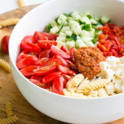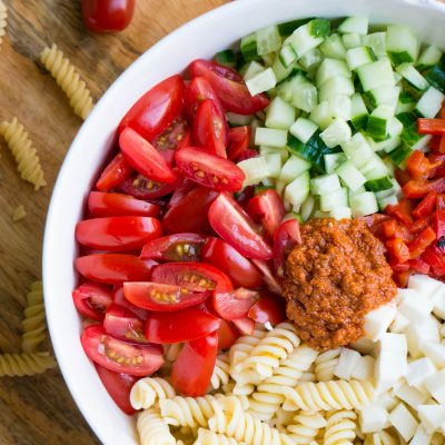 In de zomer eten wij graag salades, maar hoe maak je nou een salade die jouw kinderen ook eten? Mijn Snelle Rode Pesto Pastasalade is altijd een succes! Logan en Parker houden sowieso van pasta en door het gebruik van rode pesto creëer ik meer het idee van rode pastasaus. Door de pasta gaan allemaal ingrediënten die mijn kids zo uit het vuistje eten. So what is not to love. Een snelle salade, die perfect is als maaltijd of natuurlijk mee kan voor een picknick lunch.